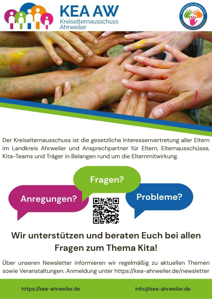 - Wir sind Ansprechpartner und Interessensvertreter für die Eltern, Sorgeberechtigte und örtliche Elternausschüsse der 77 Kitas im Kreis Ahrweiler bei Fragen, Problemen, Anregungen.